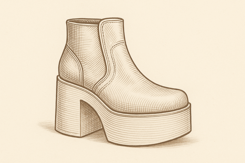 A bota plataforma tem sola espessa e altura contínua sob todo o pé, elevando alguns centímetros sem inclinar demais o calcanhar. Quando usar: no dia a dia urbano, em clima ameno ou frio leve, para acrescentar altura e presença com mais estabilidade.