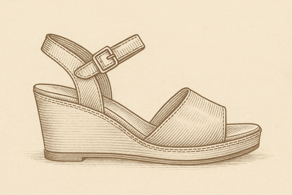Diferentemente de plataformas puras, o desnível entre calcanhar e biqueira pode ser moderado, garantindo altura com conforto no caminhar.