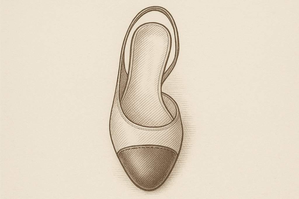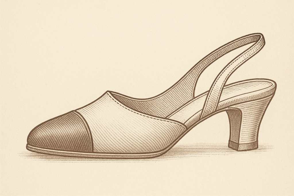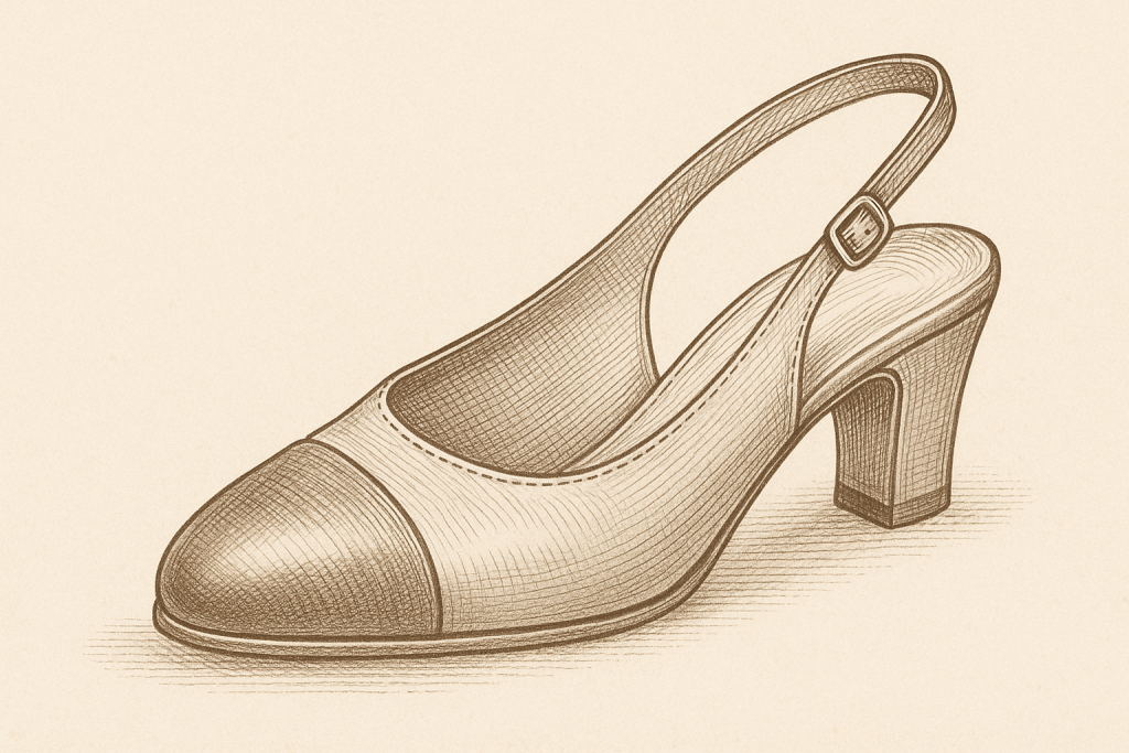 Sapato Chanel, também chamado de slingback, é um sapato fechado na frente, com calcanhar aberto e tira ajustável atrás. Oferece elegância leve e ventilação, mantendo o pé seguro para rotinas urbanas e eventos sociais em ambientes internos.