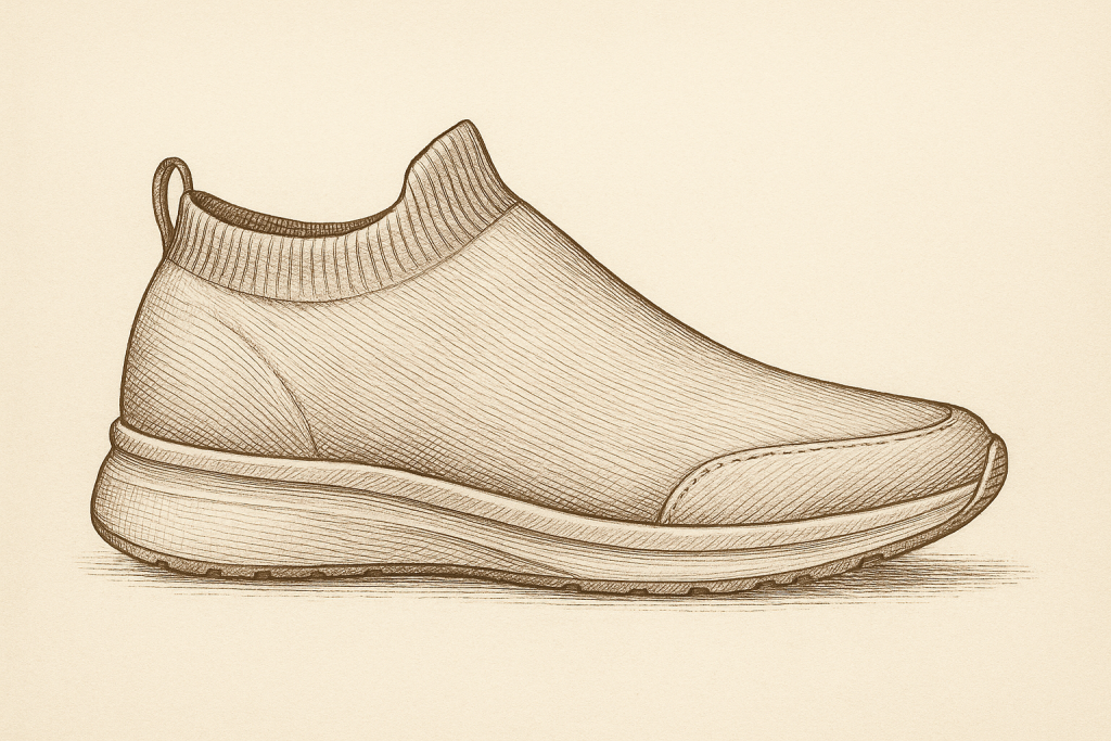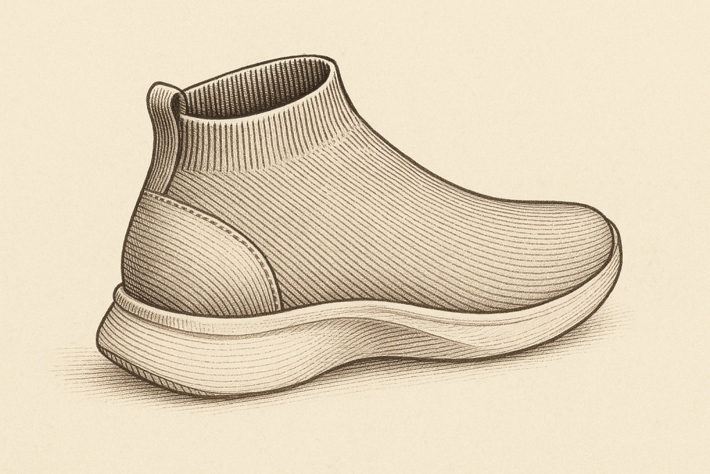Definição: é um tênis com cabedal elástico tipo meia, geralmente em knit, que envolve o pé sem costuras rígidas e facilita calçar.